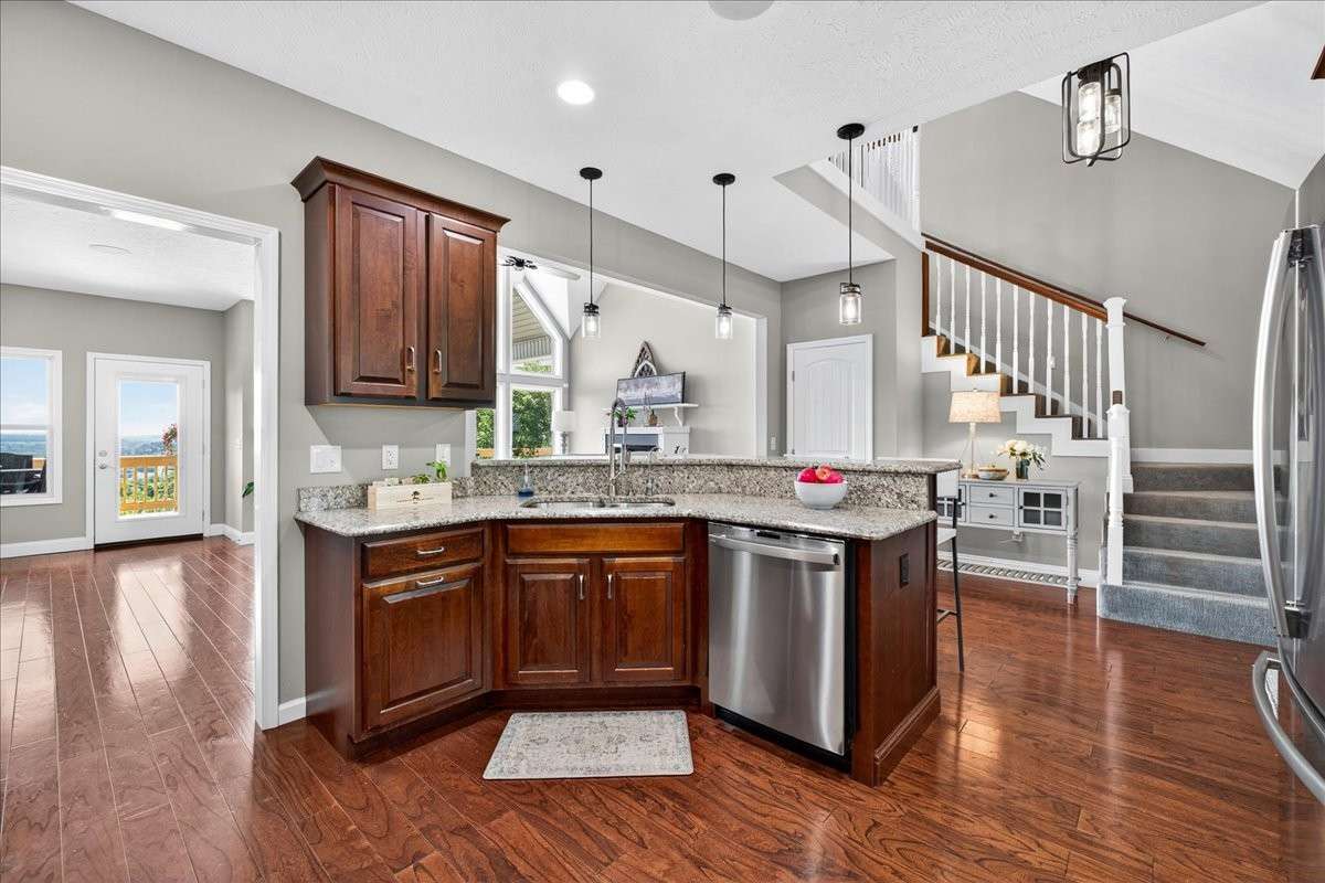 The sellers are taking a break from Showings through the Holidays. The lower level extends the living experience with a private apartment featuring a large bedroom, full kitchen with laundry, media/ den, and access to the two- car garage. Practicality and peace of mind are built in with a concrete safe room, generous storage, and thoughtful additions by the current owners: extended retaining walls, yard equipment storage, covered parking, and RV- ready connections with water, power, and septic.
