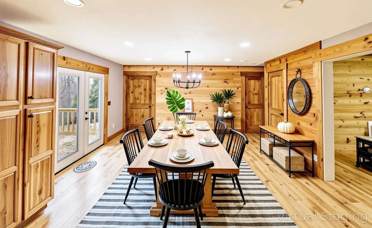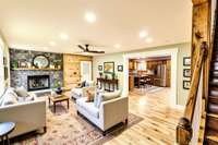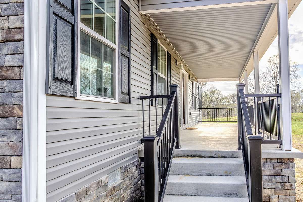 The exterior captivates with its durable vinyl siding, artfully accented by natural stone trim and a striking stacked stone chimney, ensuring curb appeal and understated elegance.