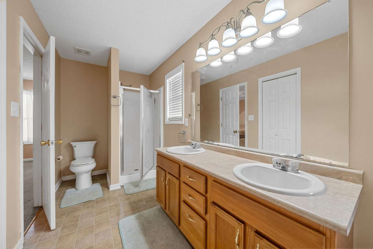 The bright eat- in kitchen features stainless steel appliances and an oversized dining area, ideal for family gatherings or entertaining friends. The main- level owner’s suite offers a walk- in closet and a private bath with a separate tub and shower for your retreat at the end of the day.