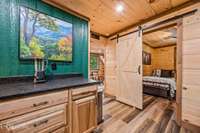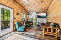 Inside, you' ll find a warm and inviting living space with a striking wood- burning stone fireplace, vaulted ceilings, and a balcony off the upper- level living room that overlooks the serene setting. The full kitchen, dining area, and dedicated remote workspace make it practical for both vacation and extended stays.