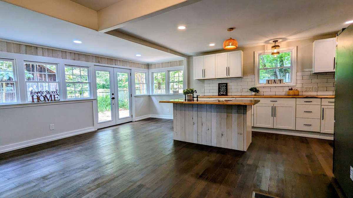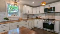 BIG Price Reduction! Welcome home to this charming, completely remodeled farmhouse, where modern comfort meets timeless style. An inviting wrap- around porch offers the perfect spot for sipping sweet tea and relaxing. Step inside to a sun- filled, open- concept living space seamlessly connecting the living room, dining room, and kitchen. The gourmet kitchen is a chef' s dream, featuring sleek, new appliances, a lovely island, and rustic butcher- block countertops. The main level includes two spacious bedrooms and two full baths, along with a convenient utility room. Upstairs, you' ll find two additional bedrooms and another full bathroom. The property includes three storage buildings, providing ample space for all your needs. Don' t miss this beautiful, move- in- ready home. Seller willing to convert upstairs to be the Complete Primary Bedroom and private bathroom w/ separate tile shower and bathtub w/ an accepted offer.