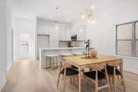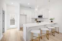 The chef’s kitchen is a true showstopper—featuring quartz countertops, a 9+ ft peninsula island, tile backsplash, custom- built soft- close cabinetry, and stainless steel appliances.