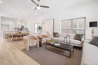 Step into this stylish 2- story condo with soaring 10- ft ceilings and an open floor plan designed for modern living. The home boasts Mohawk Revwood laminate flooring throughout ( no carpet! ) and a striking solid wood staircase.