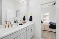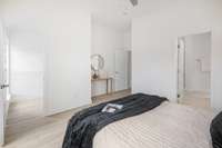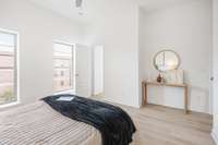 Retreat to the spa- like primary suite with a large glass- enclosed shower, floor- to- ceiling designer tile, mosaic tile floors, and a double vanity with quartz counters and under- mount sinks. The spacious secondary bedroom offers its own en suite bath for ultimate privacy and comfort.