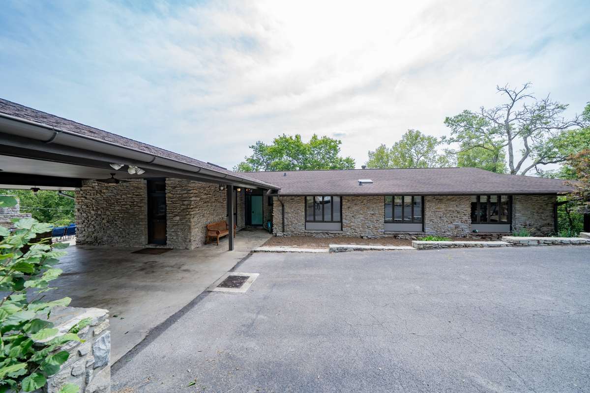 Architectural Mid- Century Gem Surrounded by Nature. This Frank Lloyd Wright–inspired ranch sits on 7+/ - private acres within Fayetteville city limits, offering a rare blend of privacy and proximity—just three blocks from the historic Square. Designed with timeless Mid- Century character, the home features 2 fireplaces, geothermal climate control, refinished hardwoods, and a custom kitchen designed in period style. The finished walk- out lower level extends the living space, while an outdoor entertaining area with a wood- burning fireplace provides the perfect retreat. A 30x60 red oak barn with a horse stall and a versatile workshop/ man cave adds function and charm. Optional 100 acres available.