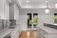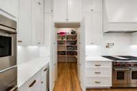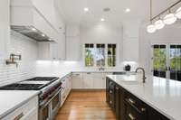Primary gourmet kitchen includes Subzero freezing and refrigeration, pot filler, 48” Wolf range, oven, Asko dishwasher, and hidden walk- in pantry. Outdoor kitchen on the covered deck includes 36” DCS grill and 24" Monogram refrigerator. Lower level kitchen includes U- Line beverage center and Scotsman ice maker.