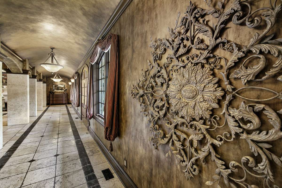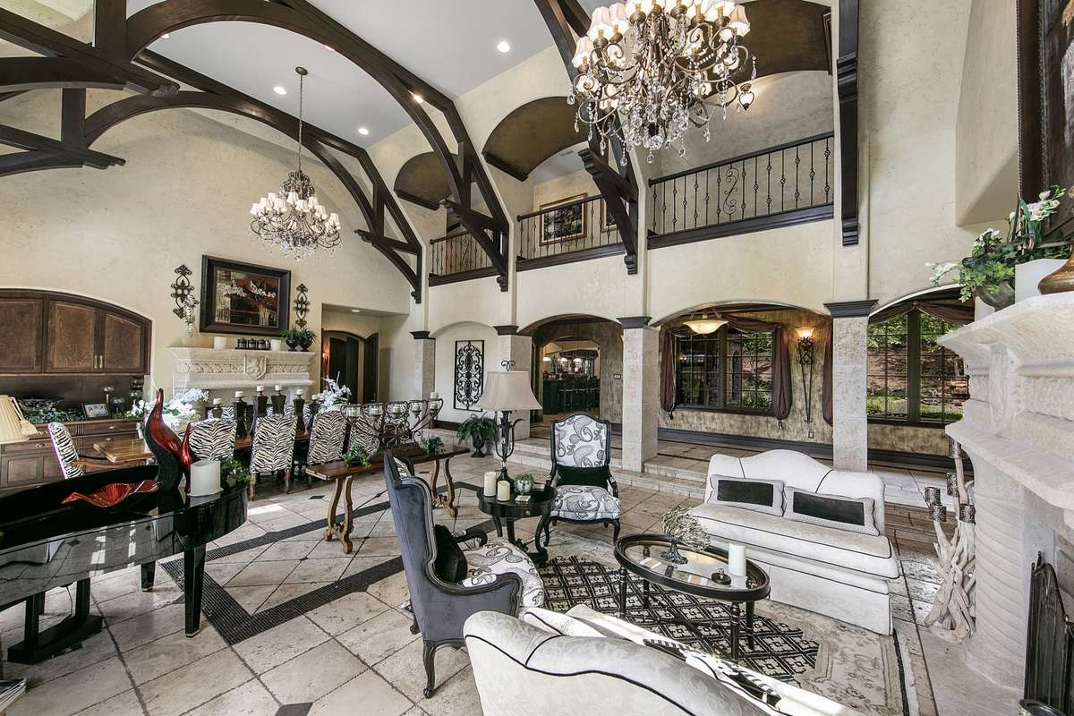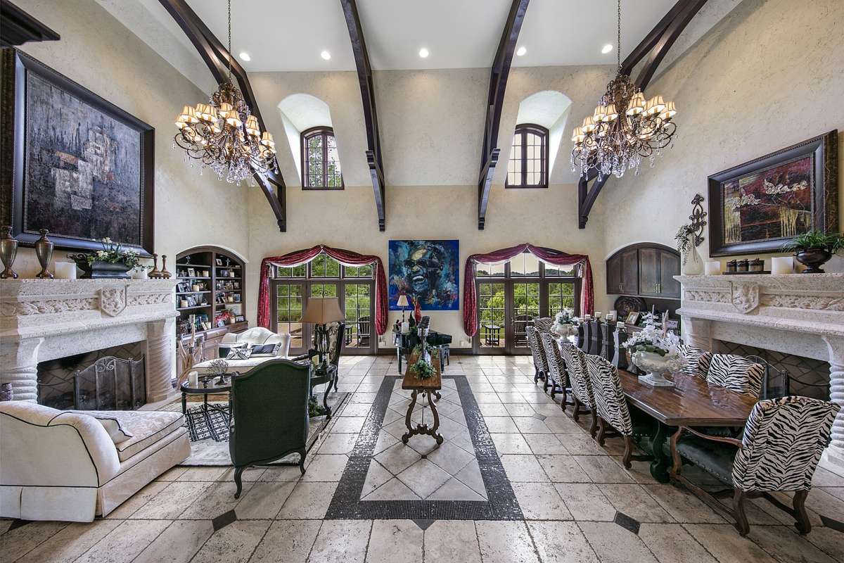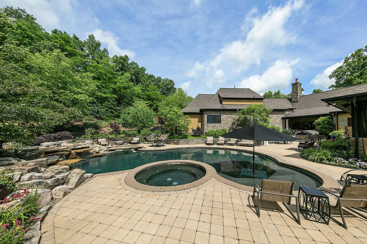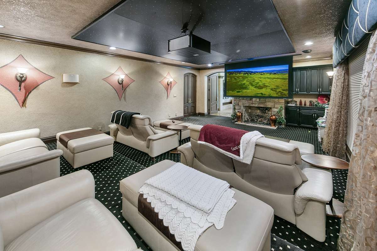 Resort- style amenities include a custom granite saltwater grotto pool, spa, theater room, 1, 000- bottle temperature- controlled wine cellar, fitness room, outdoor fireplace, outdoor TV projector, hunting grounds,  fishing lake, and even a place to land your helicopter.
