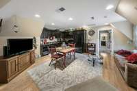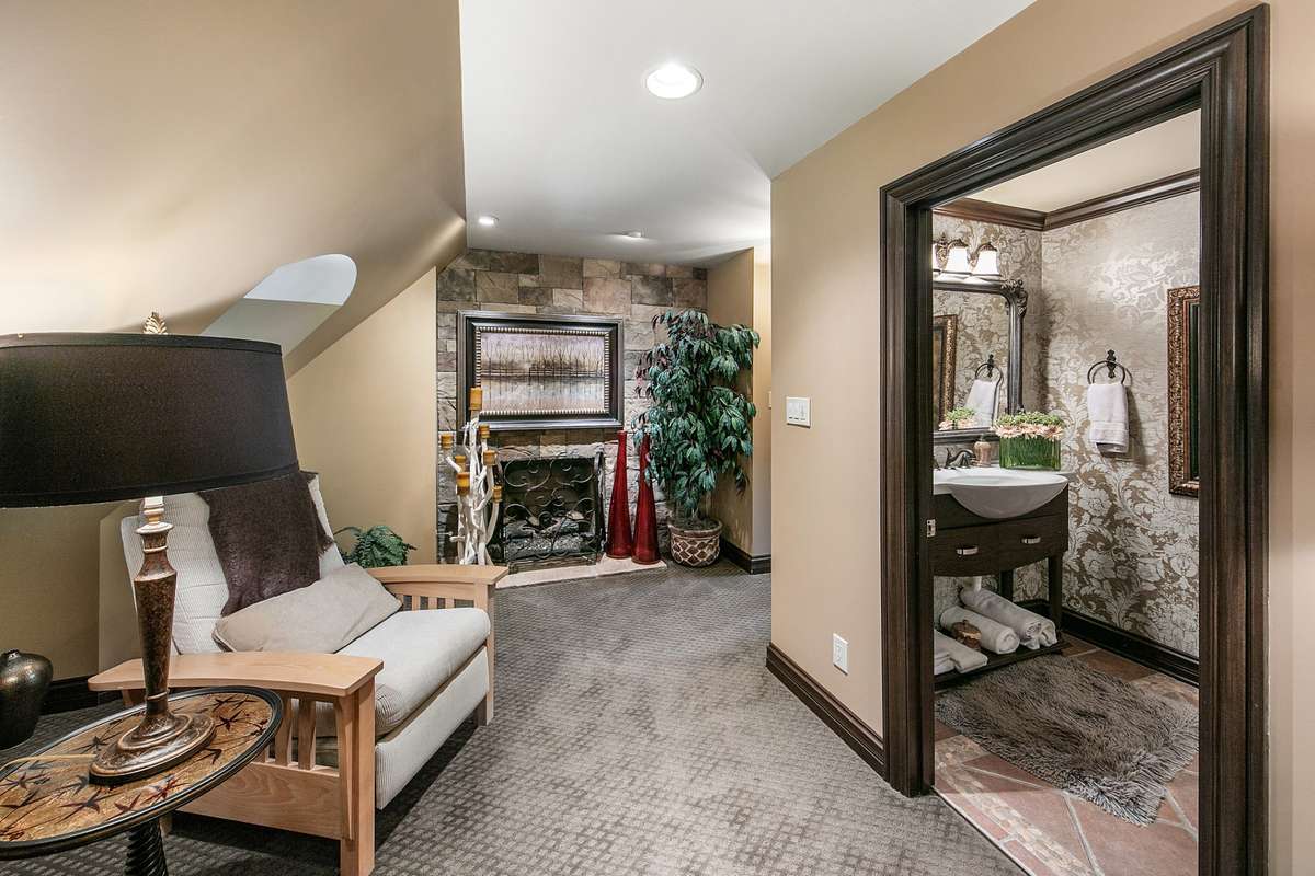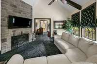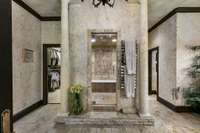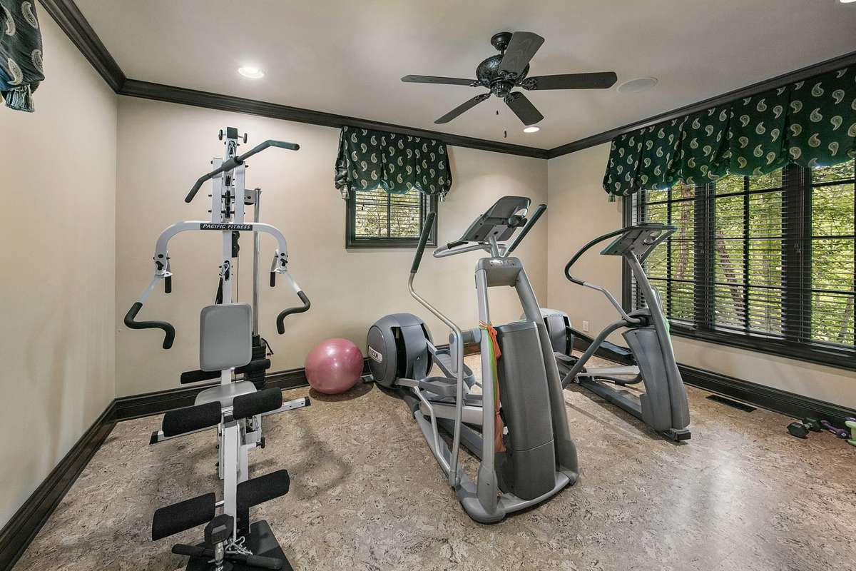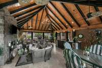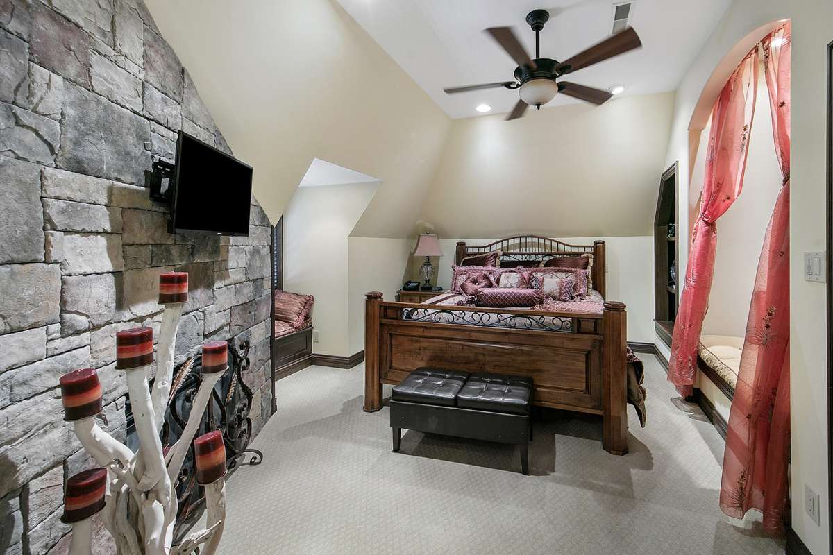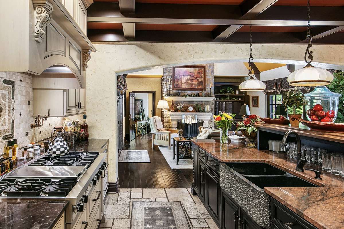 Resort- style amenities include a custom granite saltwater grotto pool, spa, theater room, 1, 000- bottle temperature- controlled wine cellar, fitness room, outdoor fireplace, outdoor TV projector, hunting grounds,  fishing lake, and even a place to land your helicopter.