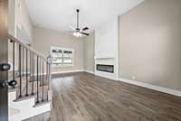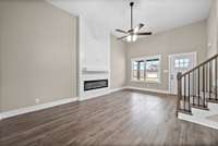 Step inside to soaring ceilings and oversized windows that fill the space with natural light. The open- concept design connects the living, dining, and kitchen areas seamlessly. A sleek linear fireplace creates a striking focal point in the living room, adding warmth and contemporary flair.