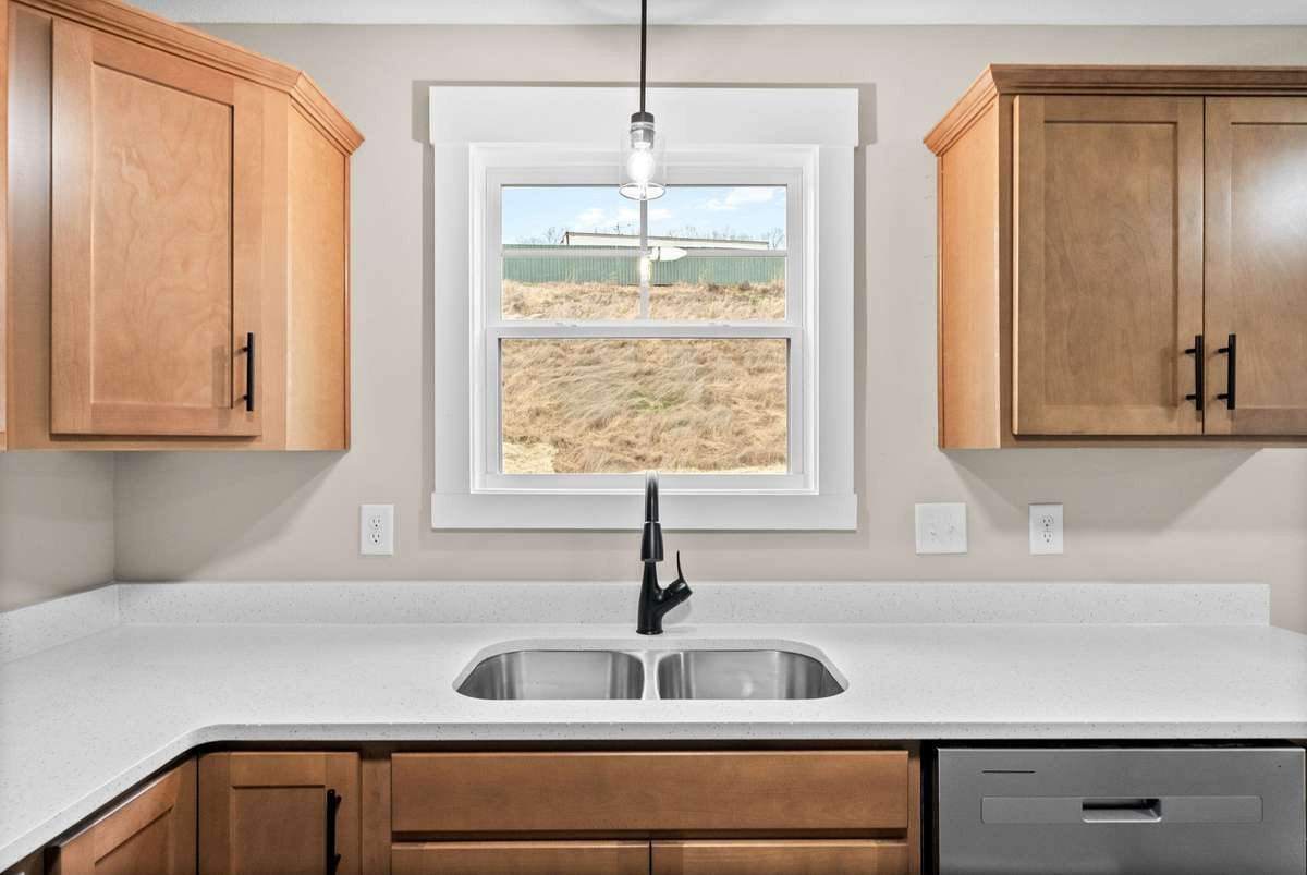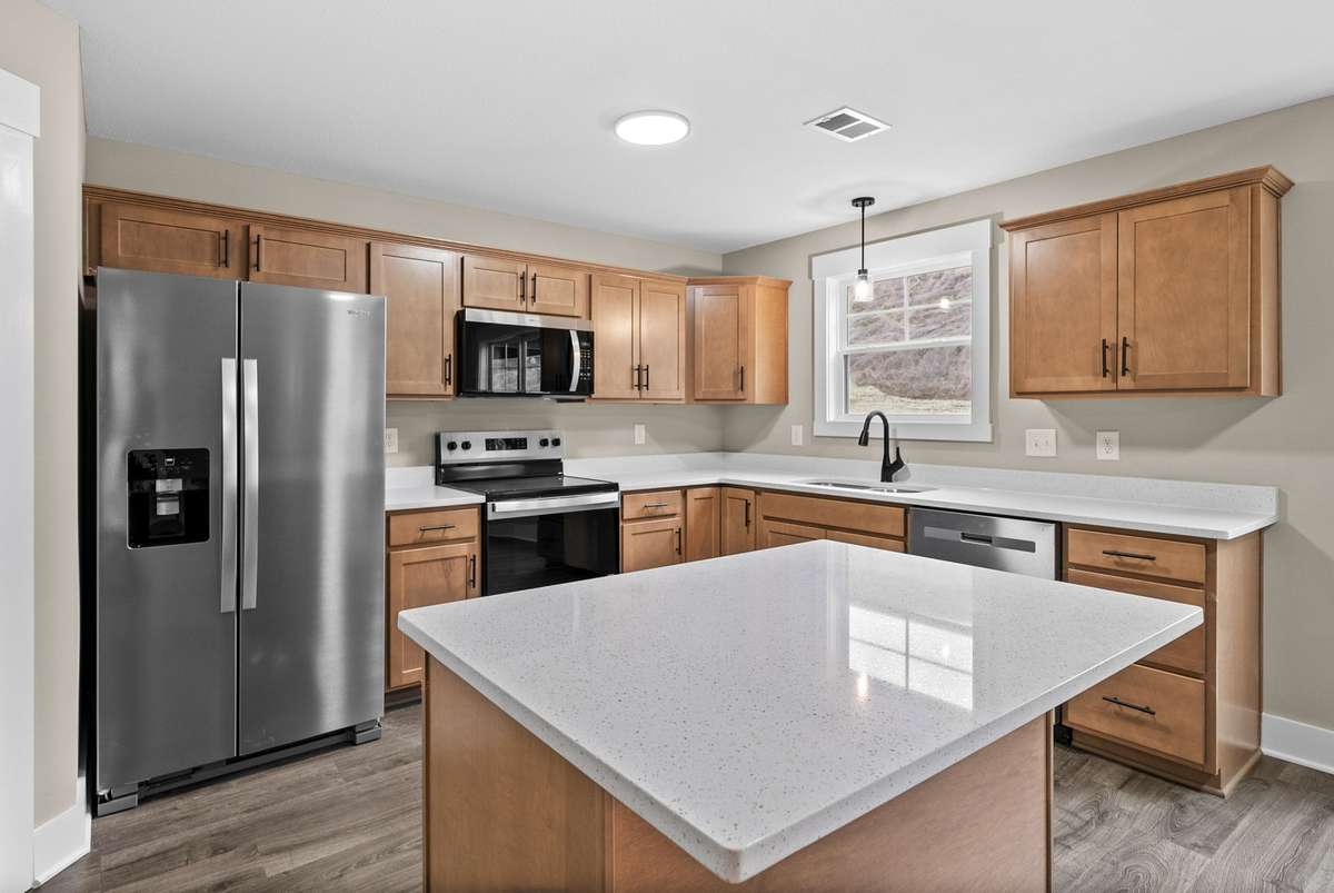 The kitchen stands out with beautiful quartz countertops, a large island perfect for prep or gathering, stainless steel appliances, and generous cabinetry—offering style and practicality whether you’re entertaining or enjoying a quiet meal at home.