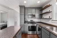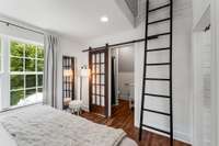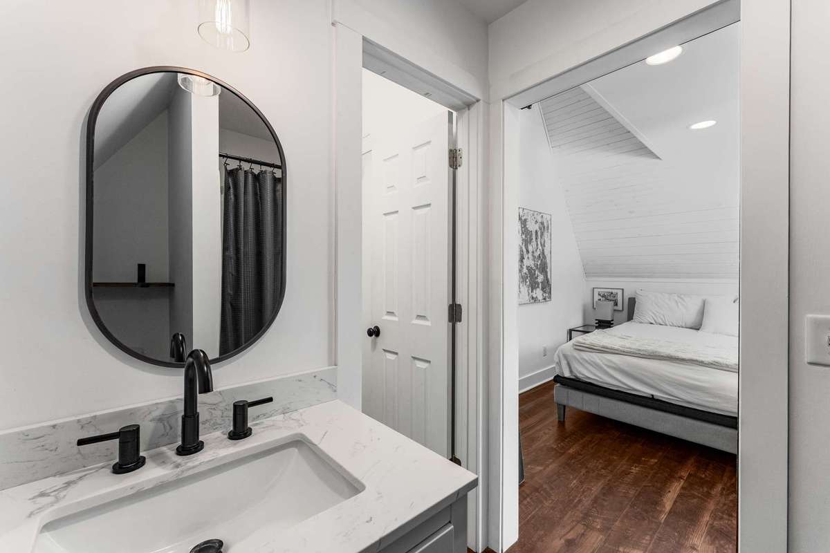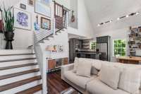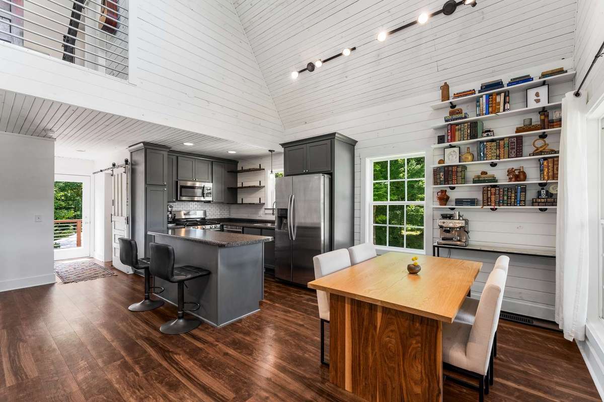 The open- concept main level features a stylish kitchen with a gas range, stainless steel appliances, bar seating, and access to a covered porch—ideal for entertaining, grilling, and unwinding in nature. Upstairs, the spacious primary suite offers treetop views, a private bath, and a ladder- access loft perfect for storage, reading, or creative escape. The walk- out basement adds incredible flexibility with a finished space ready to serve as a bedroom with its own private entrance, a gym, a home office, or a guest suite.