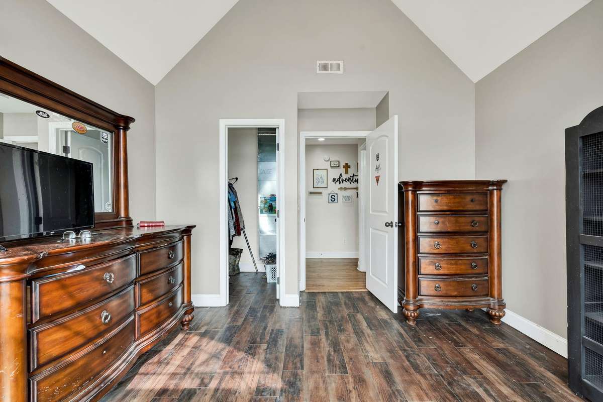 The primary suite on the main level is designed for privacy and ease, featuring great closet space and an easy- access shower. Upstairs, an additional master suite, office space, and secondary bedrooms provide flexibility for family, guests, or work- from- home needs.