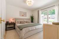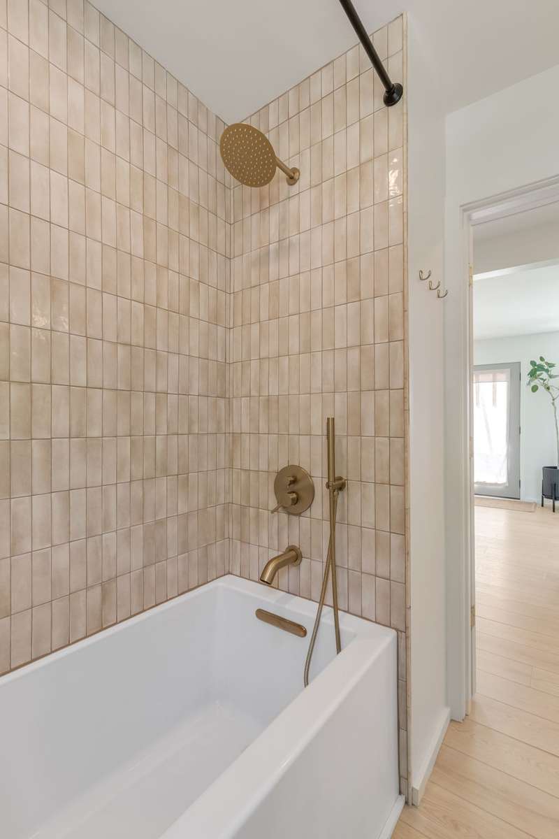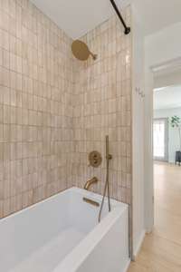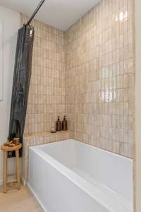 The spa like bathroom offers an extra large vanity for storage and space to get ready, a large tub and shower with designer quality tile and premium lighting and plumbing finishes.