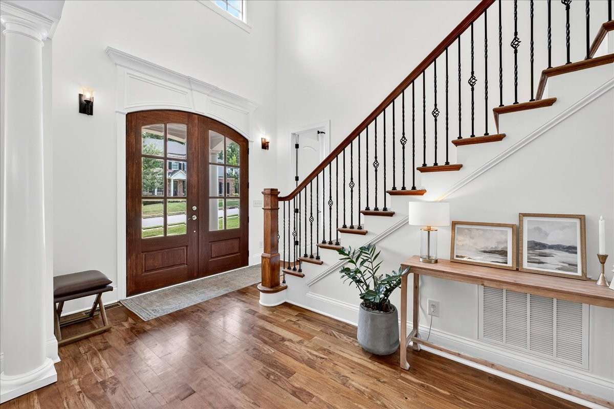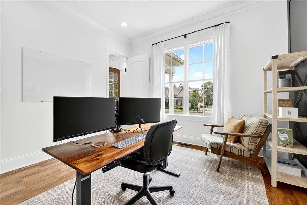 The main floor includes a private office and a spacious primary suite with spa- like bath, dual vanities, oversized shower, and custom closets. Upstairs, you’ll find three large en- suite bedrooms plus a bonus room for flexible living. Designed with function in mind, this home offers abundant storage and oversized closets in nearly every room. Additionally, Beautiful hardwood floors extend throughout the main and second floors, adding warmth and sophistication.