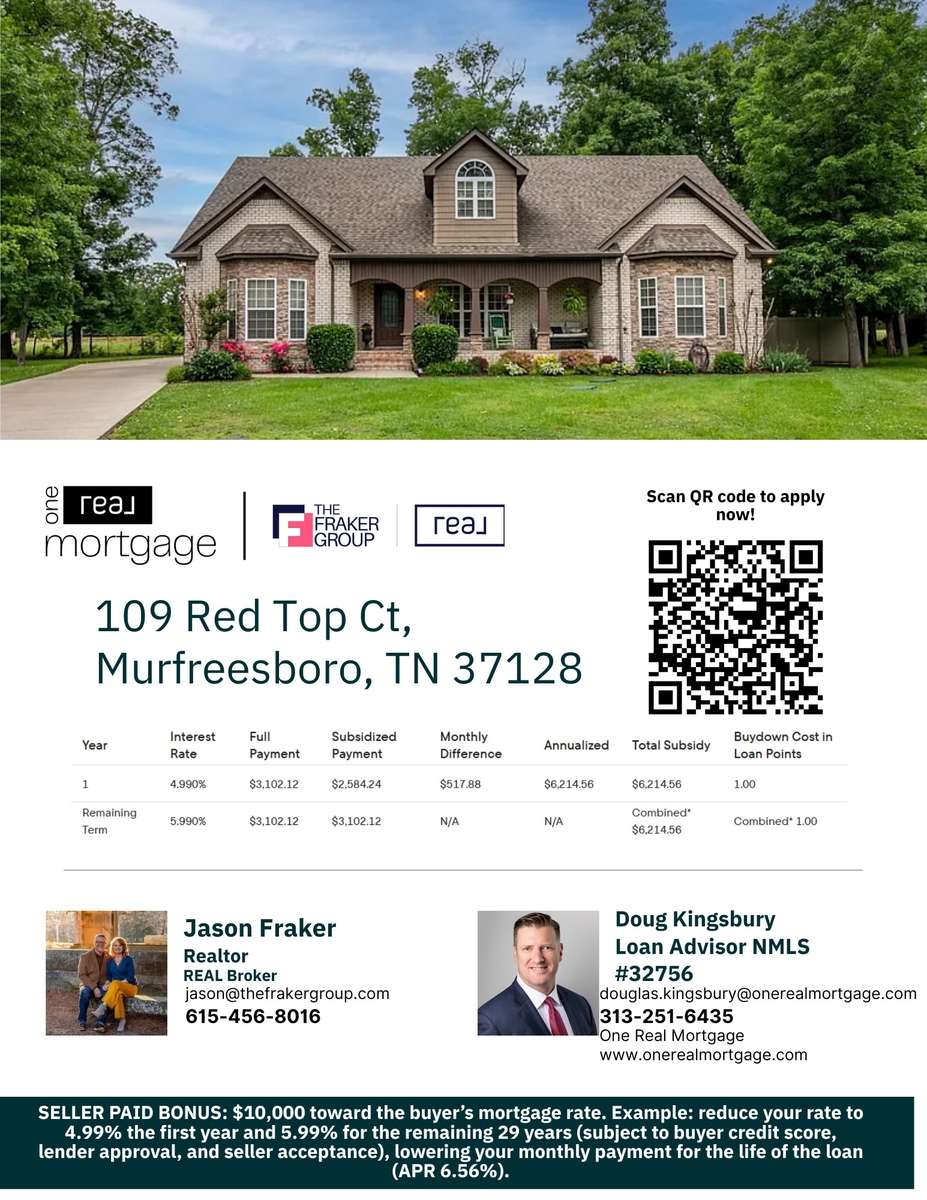 BUYER BONUS: $ 10, 000 toward the buyer’s mortgage rate. Example: reduce your rate to 4. 99% the first year and 5. 99% for the remaining 29 years ( subject to buyer credit score, lender approval, and seller acceptance) , lowering your monthly payment for the life of the loan ( APR 6. 56%) . // /