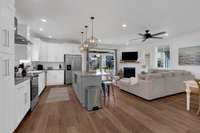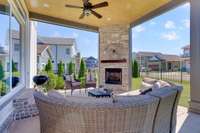 Inside, this home shines with an open floor plan and modern finishes. Luxury vinyl plank flooring runs throughout, while the spacious kitchen and living areas are designed for both comfort and style. Step out to the covered patio with cozy fireplace, the perfect spot for year- round entertaining.