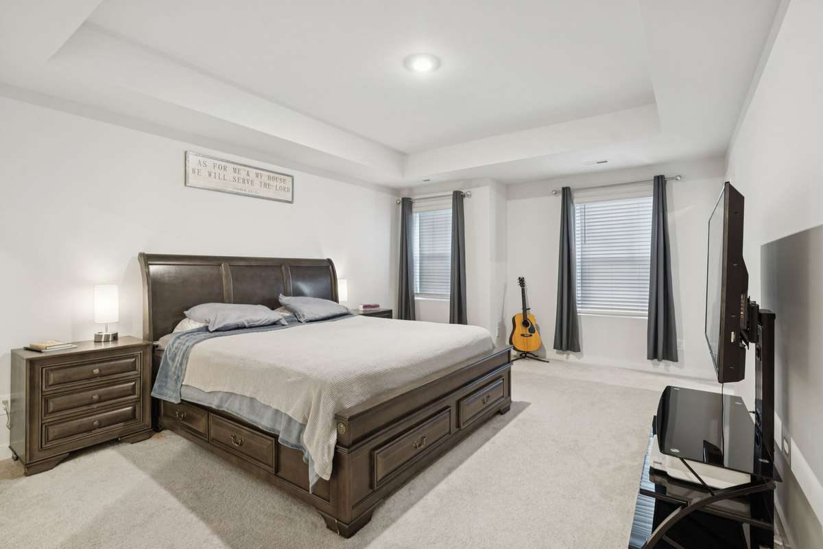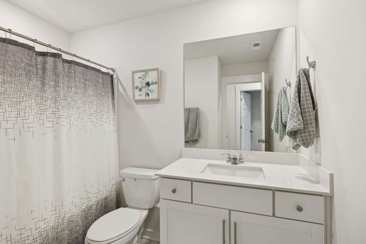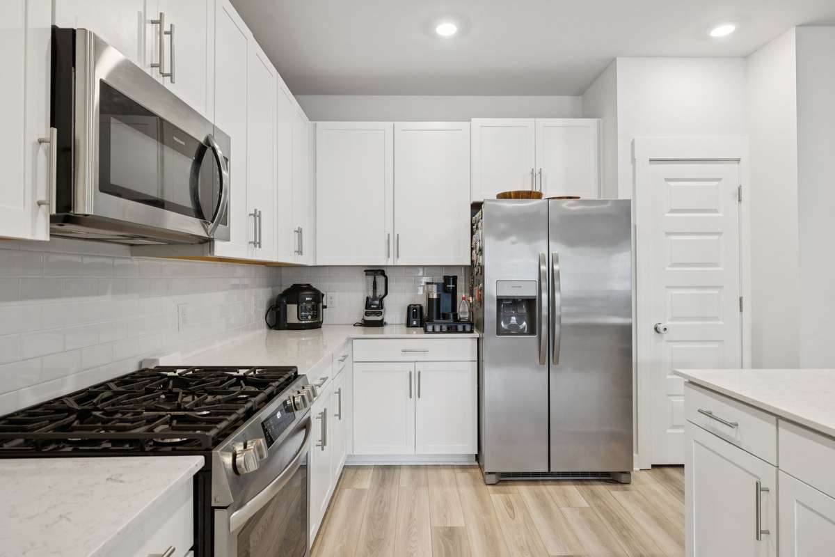Enjoy a spacious open- concept layout ideal for both everyday living and entertaining. The kitchen features quartz countertops, a stylish tile backsplash, stainless steel appliances ( including refrigerator) , and a large island with bar seating. Upstairs, the primary suite includes a walk- in closet and a private bath with ceramic tile and double vanities.