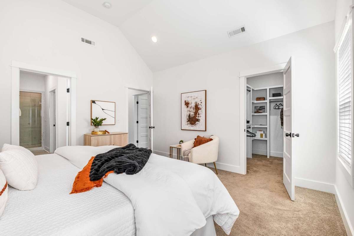 Bedrooms 3 and 4 complete the upstairs, along with a third full bathroom. Pictured here is bedroom 3 with a walk-in closet, unfurnished.
