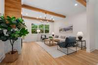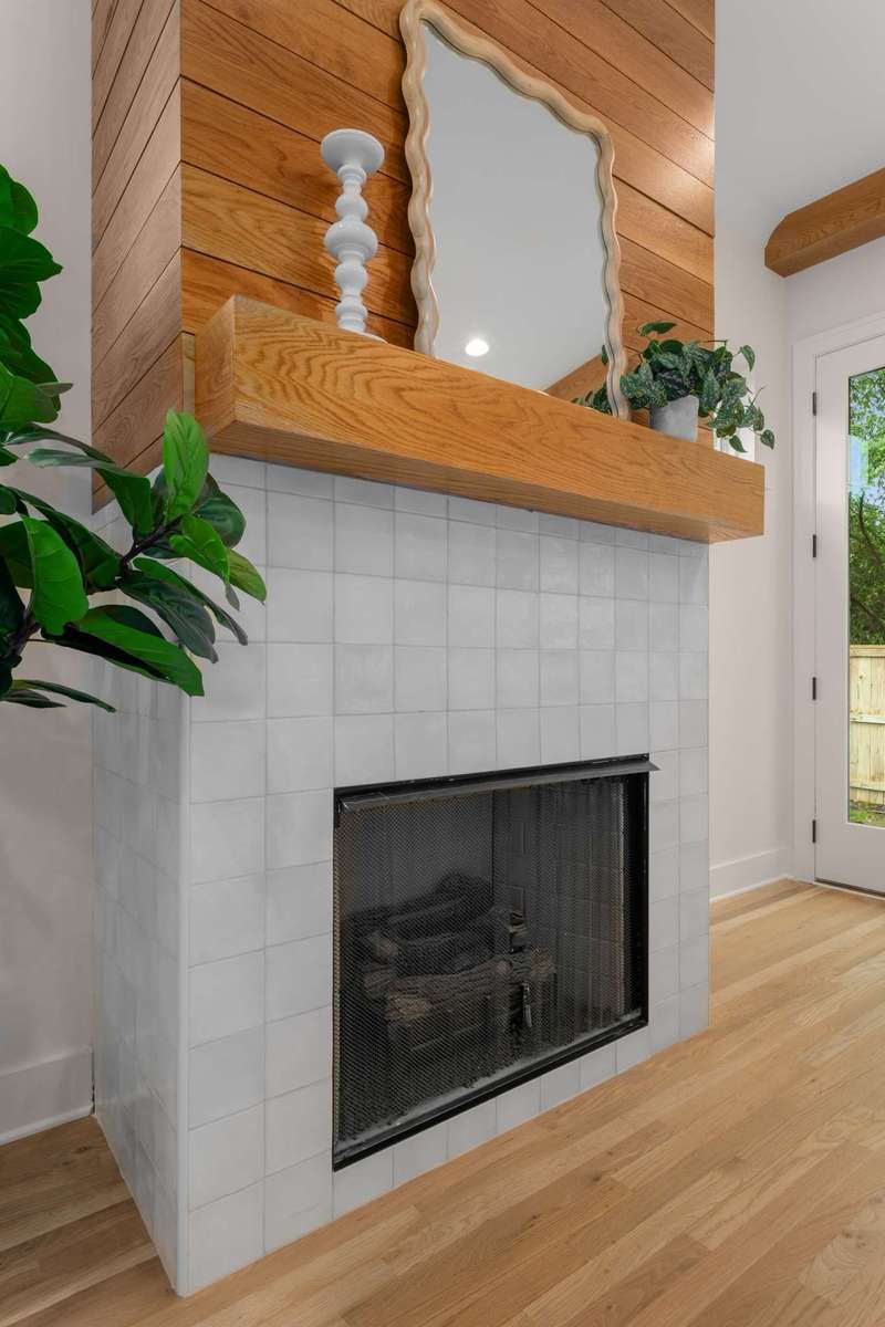 The living room is a welcoming space, featuring beautiful wood beams, contemporary lighting, and a custom fireplace. The open layout seamlessly connects to the gorgeous kitchen, which offers great storage and a convenient walk- in pantry.