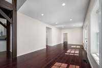 The owner’s suite offers a relaxing retreat after a long day, complete with a spa- inspired bathroom and a floor- to- ceiling tiled shower. From the back porch, take in serene views of the creek that winds through the property—an ideal spot for morning coffee or unwinding in the evenings.