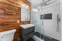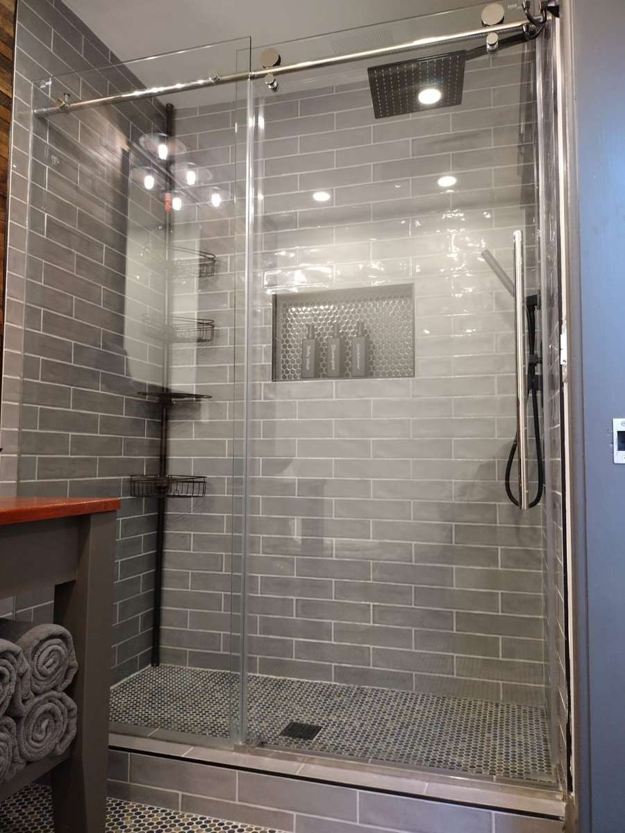 Studio: Bathroom is beautifully tiled, and features glass sliding doors.