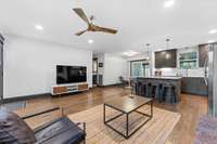 This home offers a dual living layout. Main area, features an open concept ideal for entertaining, 3 beds, 2 full baths, a fully equipped kitchen with quartz countertops, gas range stove, spacious dedicated laundry room & enclosed porch. Second living area, has 1 bedroom and 1 full bath, with its own entrance, and completely independent living areas. Major system updates offer peace of mind, including: roof, HVAC ( with new ductwork) , and windows all replaced within the past 5 years.