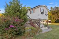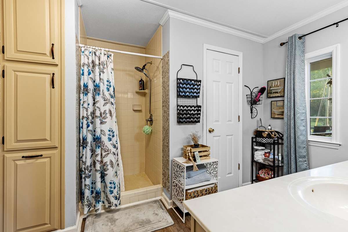 The primary bedroom is bathed in natural light and opens to a spacious en- suite bath complete with a walk- in shower, dual sinks on a double vanity, and abundant cabinetry for storage. Two additional bedrooms share a well- appointed bathroom, while a dedicated laundry room with sink and exterior exit adds convenience.
