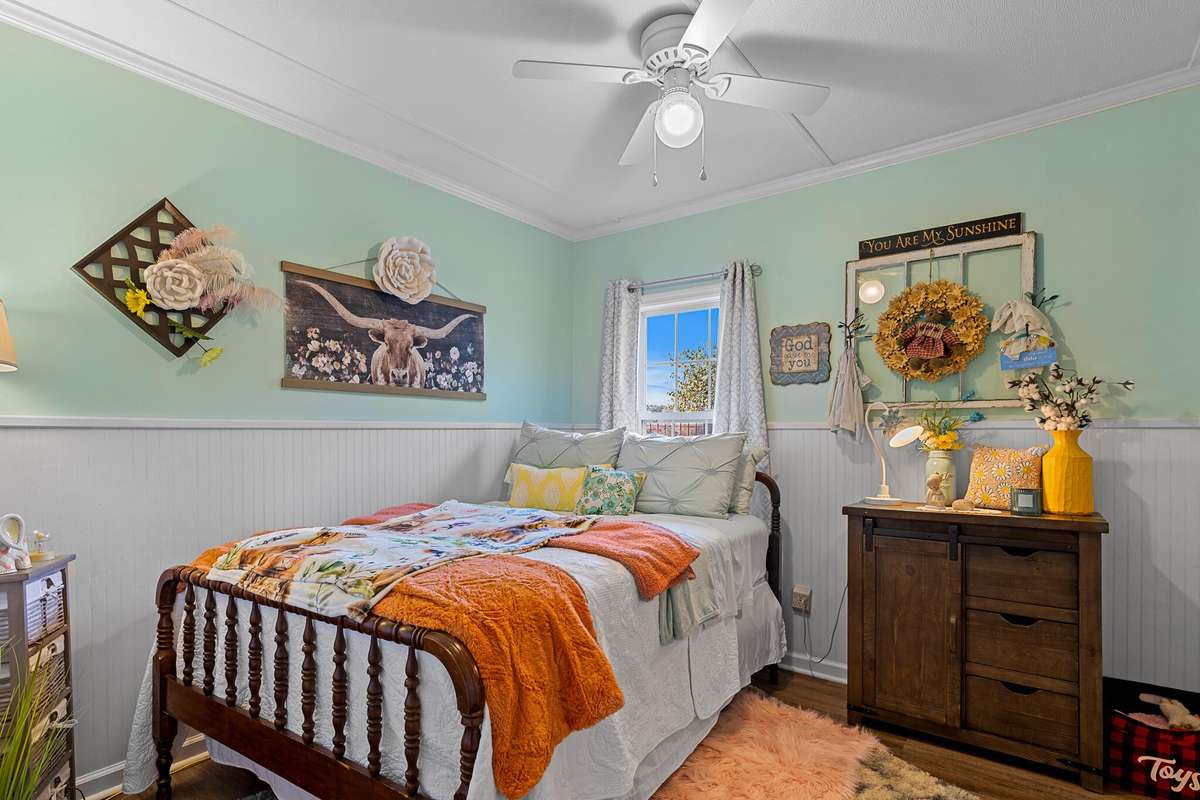 Outdoors, you' ll find a fenced garden area leading to a unique bonus structure featuring a playroom, extra living space, and a basement bunker room—perfect for hobbies, recreation, or storage. The property also boasts a large three- car carport, a barn within the fenced pasture, and two additional storage buildings for all your needs.