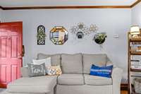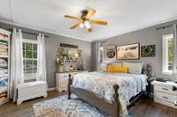 The primary bedroom is bathed in natural light and opens to a spacious en- suite bath complete with a walk- in shower, dual sinks on a double vanity, and abundant cabinetry for storage. Two additional bedrooms share a well- appointed bathroom, while a dedicated laundry room with sink and exterior exit adds convenience.