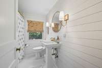 Both bathrooms were updated with shiplap, new tile surround and on floors, plumbing, and lighting fixtures from Ferguson.