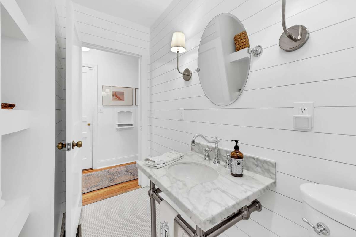 Both bathrooms were updated with shiplap, new tile surround and on floors, plumbing, and lighting fixtures from Ferguson.