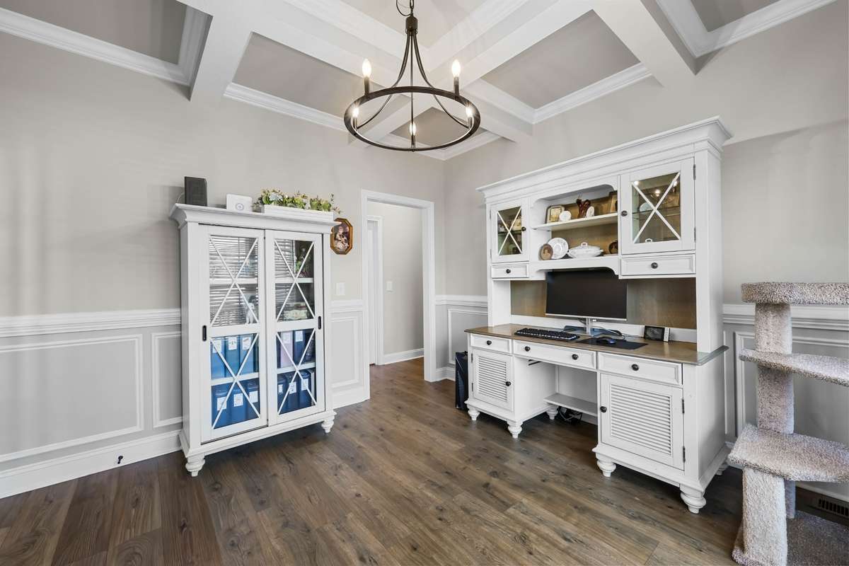 This is the dining room that is being used as an office for now.  It has a beautiful coffered ceiling and French doors that go to the foyer!