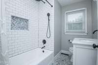 Step inside to find a spacious living room featuring a custom built- in bookshelf and gleaming hardwood floors. The kitchen has been completely renovated with new tile flooring, modern cabinets, quartz countertops, and Whirlpool stainless steel appliances. The bathroom is equally impressive with a new vanity, new tile shower surround, and updated lighting.