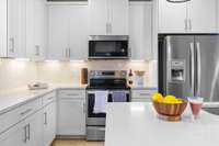 Inside, you’ll find an open- concept great room, dining area, and upgraded kitchen filled with natural light from additional windows. The kitchen features quartz countertops, designer backsplash, upgraded cabinets, and a premium appliance package. Hardwood floors, iron railings, oak tread stairs, and designer lighting add a refined touch throughout.
