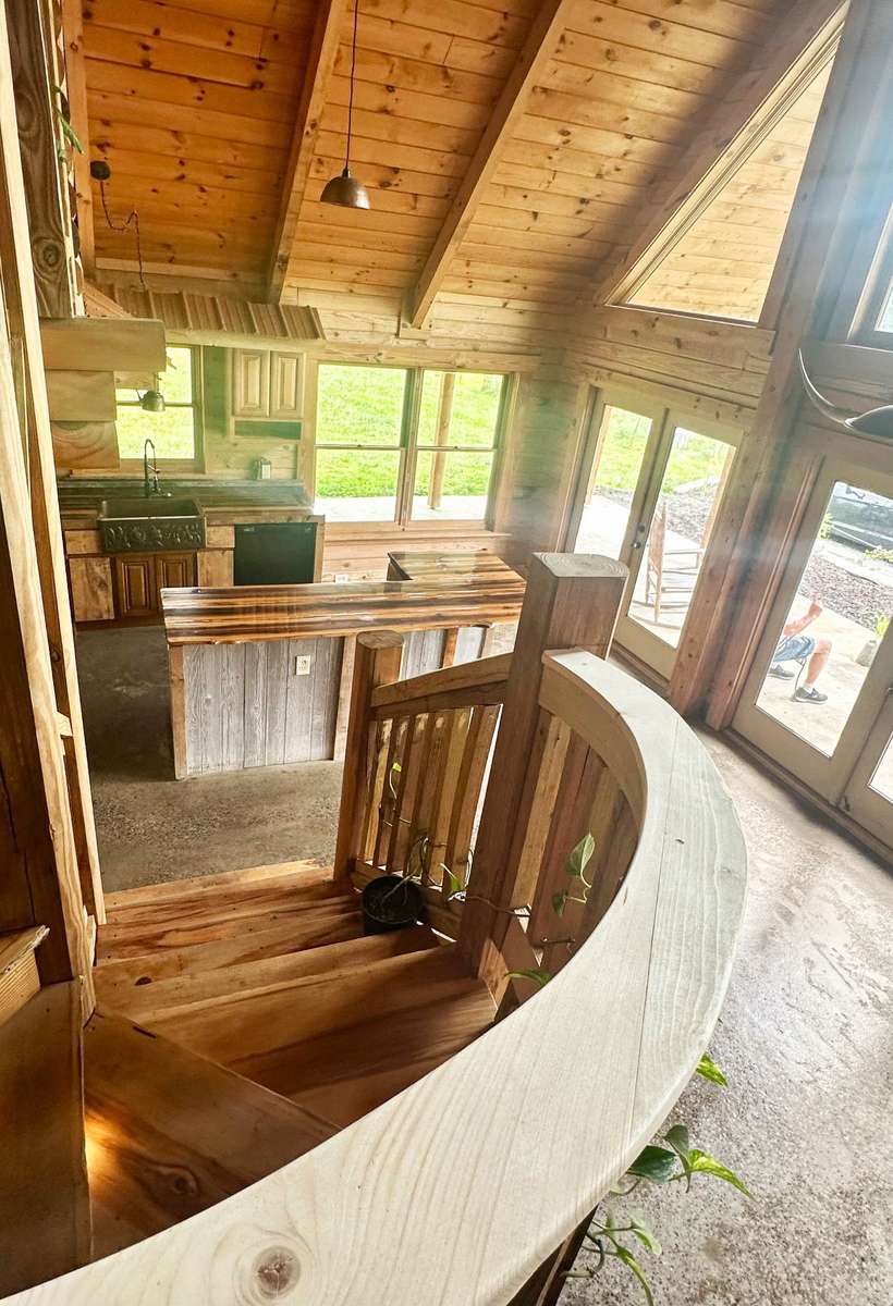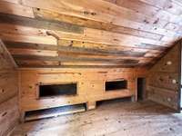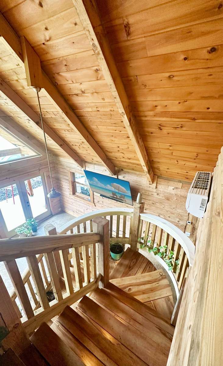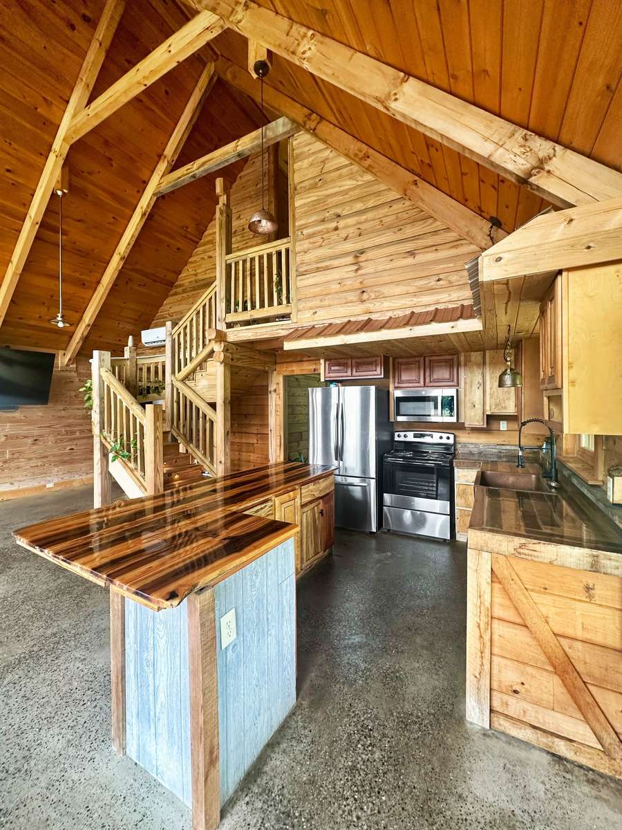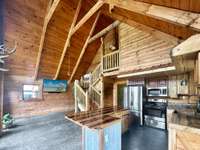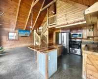 Inviting Loft Suite: The second- floor loft is a perfect retreat, featuring built- in bunk beds with trundle beds and a full bathroom, complete with a rustic log garden tub for ultimate relaxation.