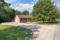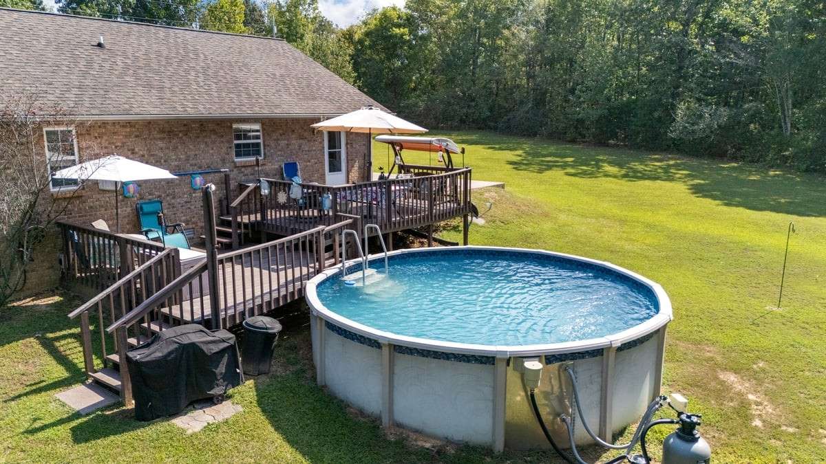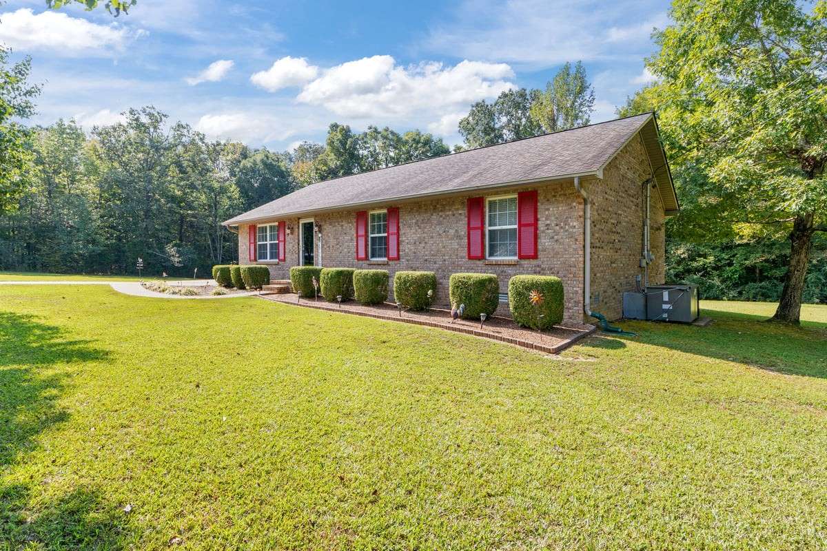 PARK- LIKE 1. 69 ACRE PARADISE WITH A POOL - Charming curb appeal makes a stunning first impression. Well maintained home & grounds near the end of a quiet cul- de- sac. One- level living with waterproof laminate & ceramic tile flooring throughout. Primary bedroom provides a walk- in closet, double vanities & an oversized shower. Generous guest bedrooms each have spacious closets & access to a full hall bath. Open living area with lots of natural light from multiple windows. Eat- in kitchen with loads of cabinets storage & a large dining area. New 50 gallon water heater. Lovely lot lined with beautiful bradford pears in the front. Wooded back & side yard for ultimate peace and privacy. Take a walk to the rear of the property to a creek. Lounge on the tiered deck and watch the hummingbirds. Enjoy the outdoor shower after taking a swim. 10x16 storage building with electric & ramp for your lawnmower. Wide concrete drive for side by side parking. Lush landscape with shapely shrubs, hardy hostas & monkey grass. Natural gas is available at the road. Convenient to schools, shopping, Pebble Isle Marina & multiple boat ramps on the Tennessee River/ Kentucky Lake.