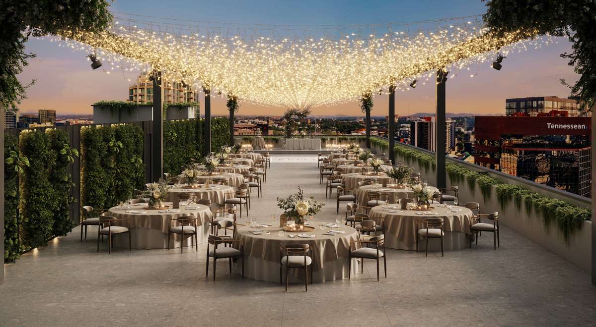 The 5,000-square-foot open-air rooftop event space, boasting breathtaking views of Nashville, is ideal for hosting weddings, album release parties, and a wide range of other memorable occasions.