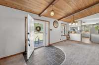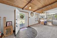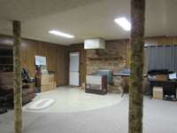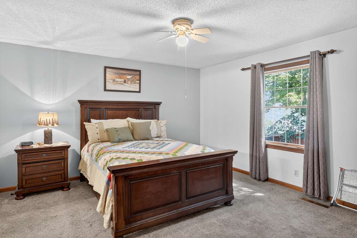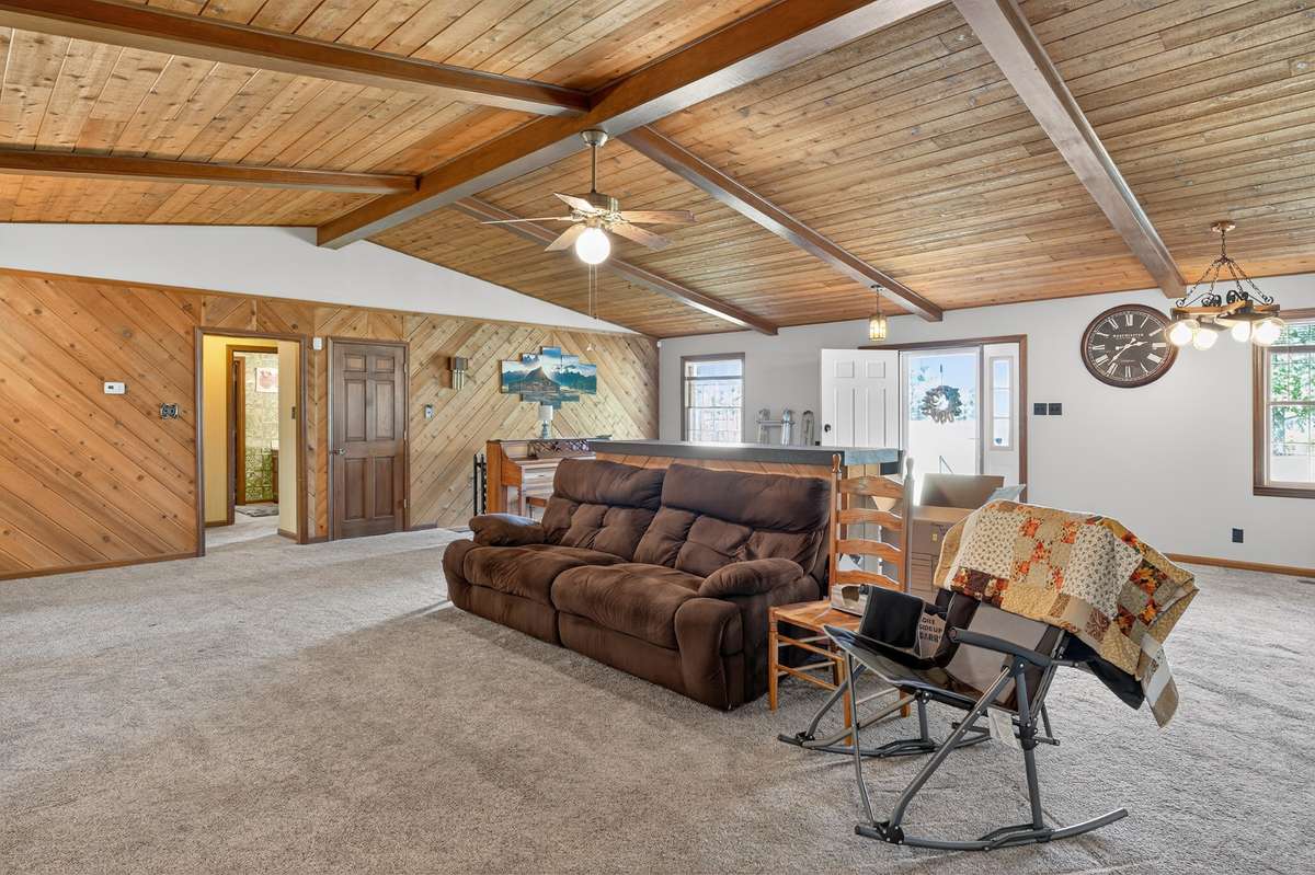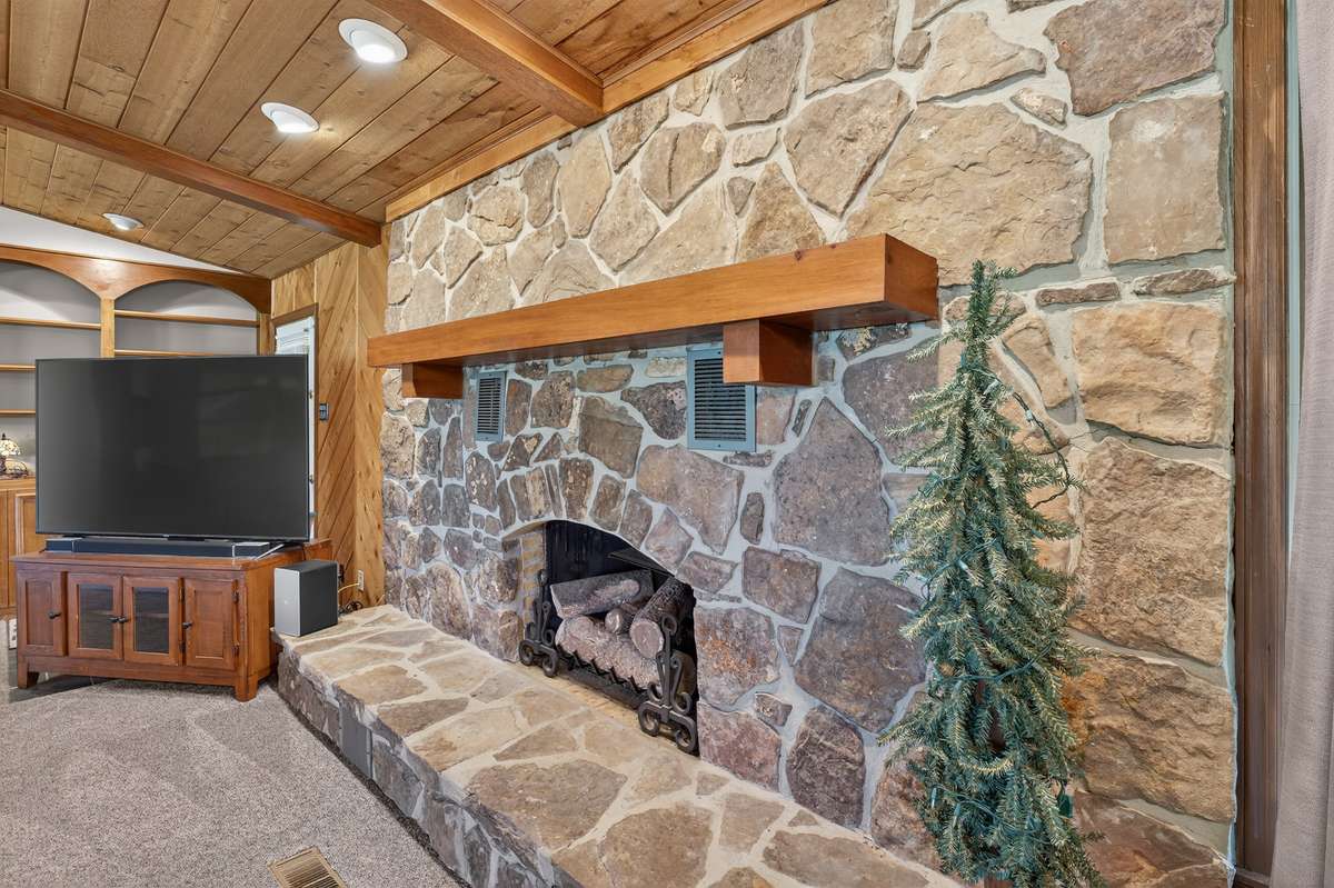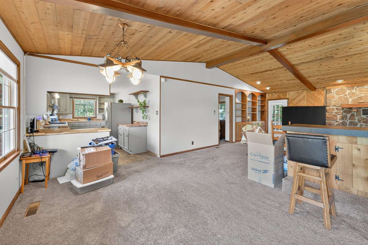 Inside, the home boasts a spacious 31' x 27' great room with vaulted ceilings, exposed beams, built- ins, a magnificent fireplace, and a versatile bar that can be moved to fit your lifestyle ( barstools included) . The kitchen has been updated with butcher block countertops, black granite steel farm sink and charming cabinet touches that create a warm, country feel.