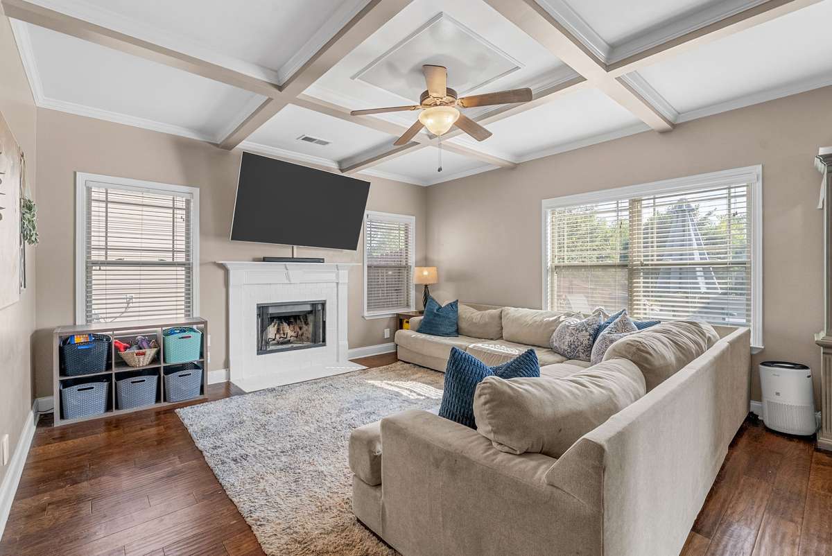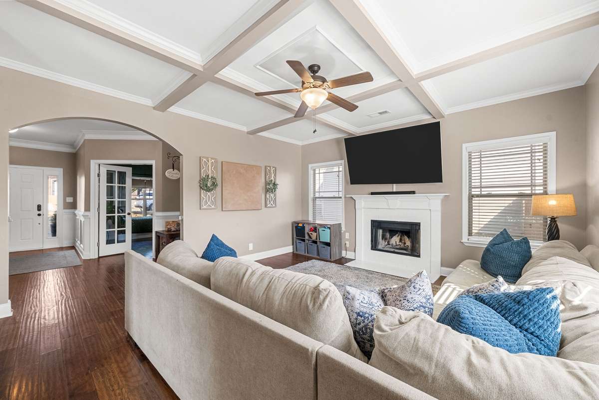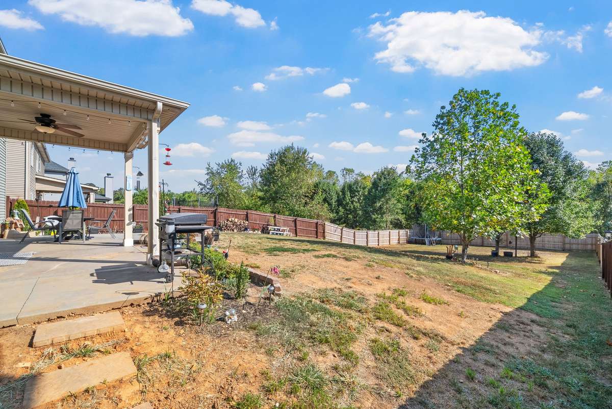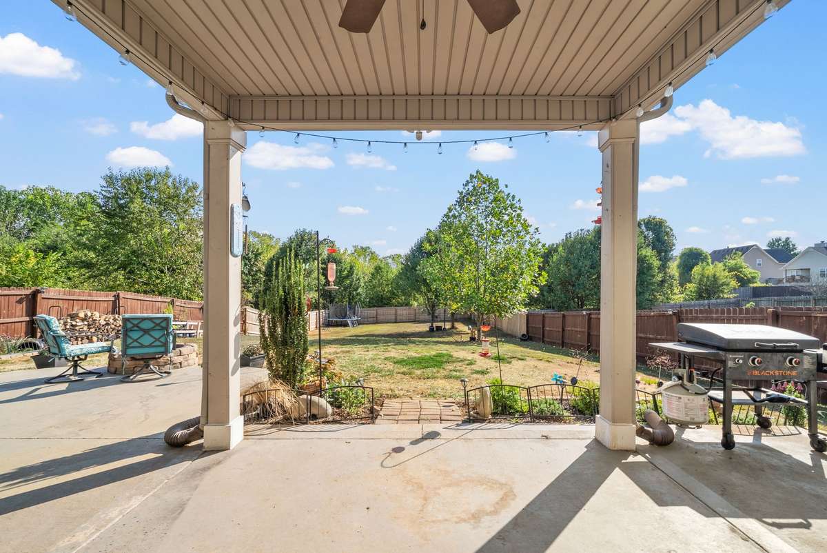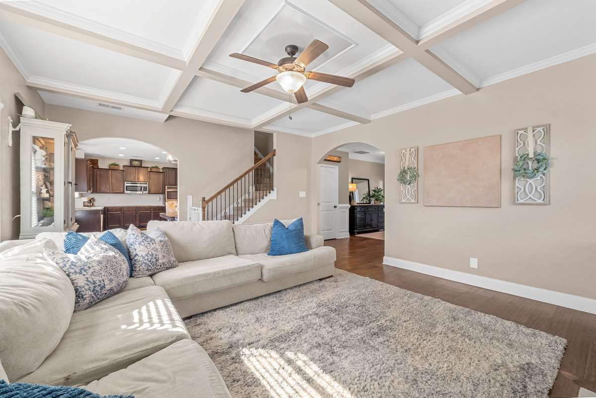 Beautiful 4- bedroom, 2. 5- bath home with a welcoming entryway and flex room that can be used as a private office or formal dining room on the main level. The living room features elegant coffered ceilings, while the bright eat- in kitchen offers plenty of space for gatherings. All bedrooms are generously sized, with laundry conveniently located upstairs. Step outside to a covered patio with an extended patio area, overlooking a large fenced backyard ideal for entertaining, pets, or play. Minutes from shopping, dining, and schools, and with no HOA, this home combines comfort, style, and freedom