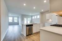 OPEN PLAN WITH ISLAND FACING DINING AREA AND LIVING AREA - WHITE CABINETRY, SUBWAY TILE BACKSPLASH, QUARTZ COUNTERTOPS, PANTRY, GAS RANGE, TANKLESS GAS WATER HEATER