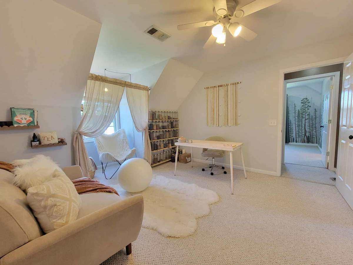 Up the stairs you enter into this beautiful room between the bedrooms.  It can be used for an office, a library, a hobby room, or even a school.  The possibilities are endless.