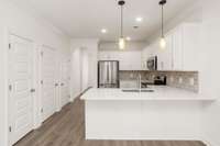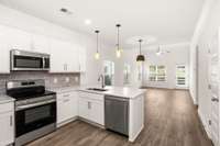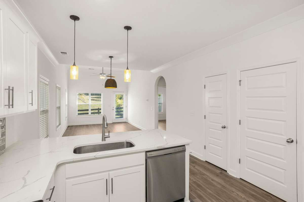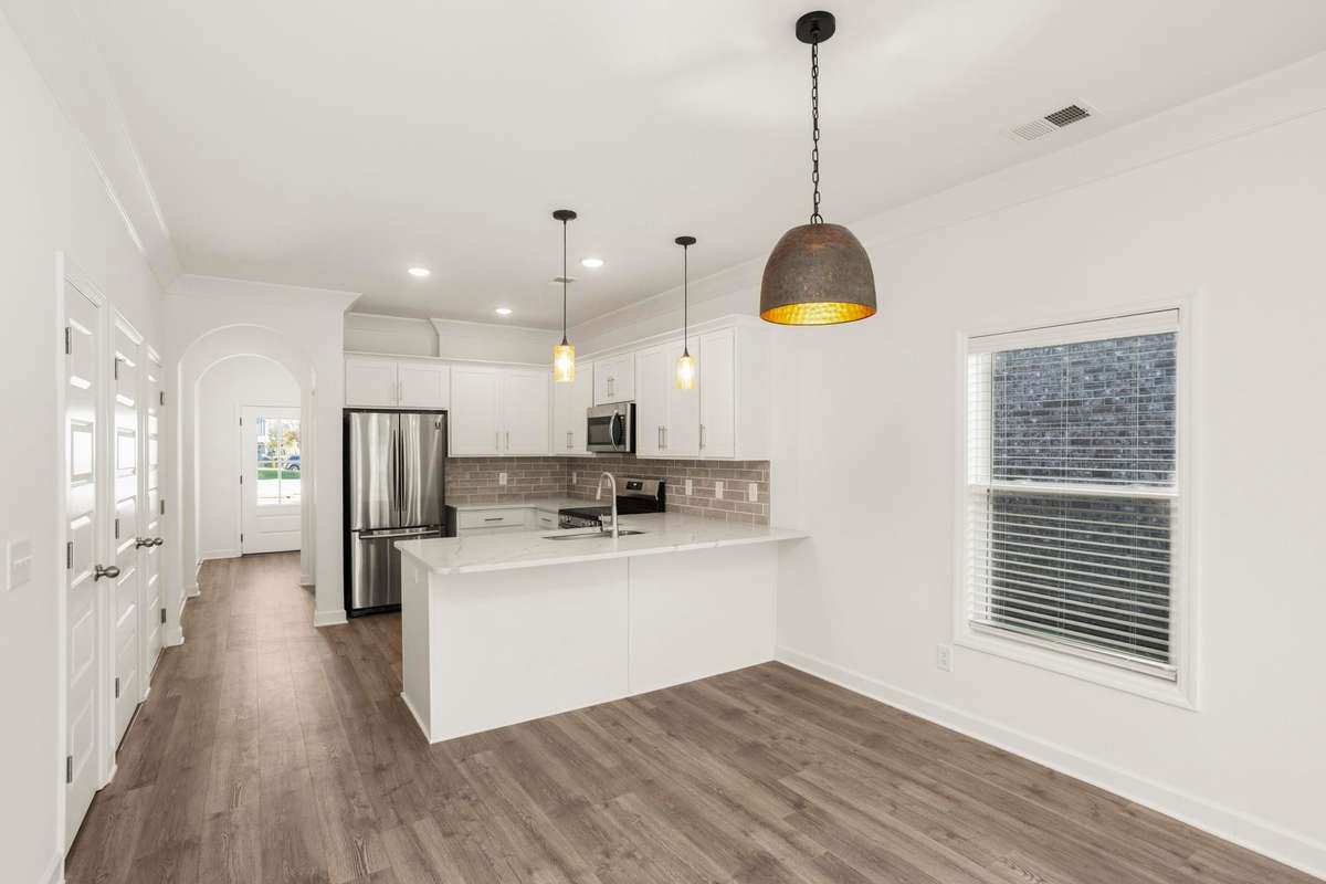 This is the Charleston floor plan with the primary suite on the main level. Only 1 year old, refrigerator and washer/ dryer remain. Upgraded light fixtures, laminate floors on the main level. This is also an end unit a with patio in the back overlooking horse farm. Club House, Playground and walking trail. Convenient to shopping and restaurants.