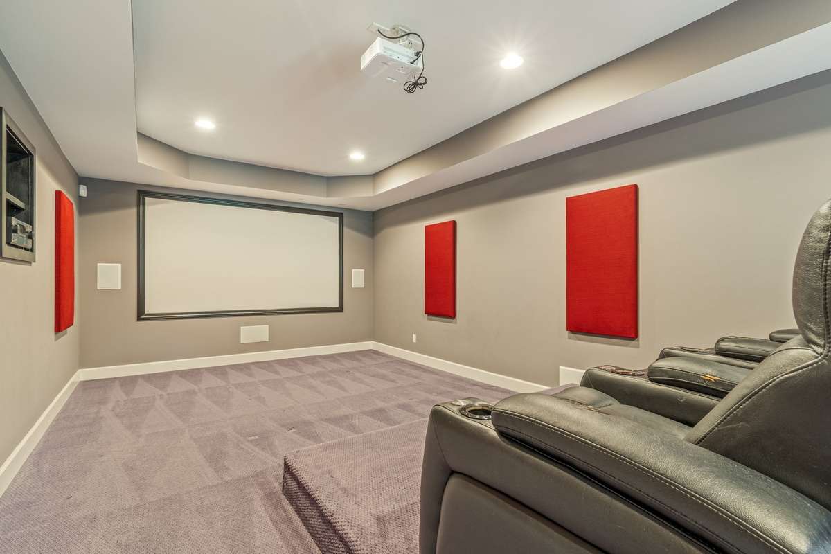 The flexible layout includes four spacious bedrooms, with the fourth easily serving as a bonus room, home office, or guest retreat. Ample storage throughout ensures everything has its place. A dedicated in- home theater is a standout feature—complete with theater seating, projector, surround sound speaker system, built- in audio, and a beverage cooler for the ultimate movie night experience.