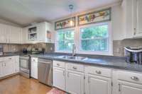 The den features a cozy pellet/ wood- burning stove along with built- in storage and a handy drop zone for all the kids’ gear. With an open floor plan, vaulted ceilings, and a breakfast bar that connects to the kitchen pass- through, entertaining feels effortless. From your kitchen window, watch wildlife stroll by or step out to enjoy the peace of your acreage.