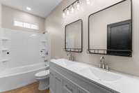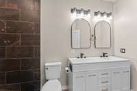 The primary suite is your private retreat with a luxurious tiled shower and dual vanities, while the second bath also offers double sinks—perfect for busy mornings or guests. Throughout the home, you’ll find engineered hardwood floors for a seamless, upscale look.