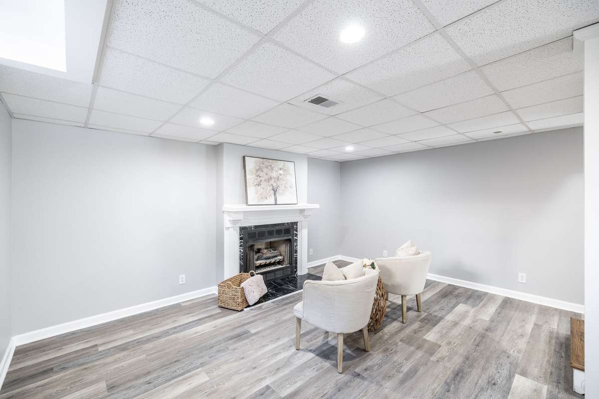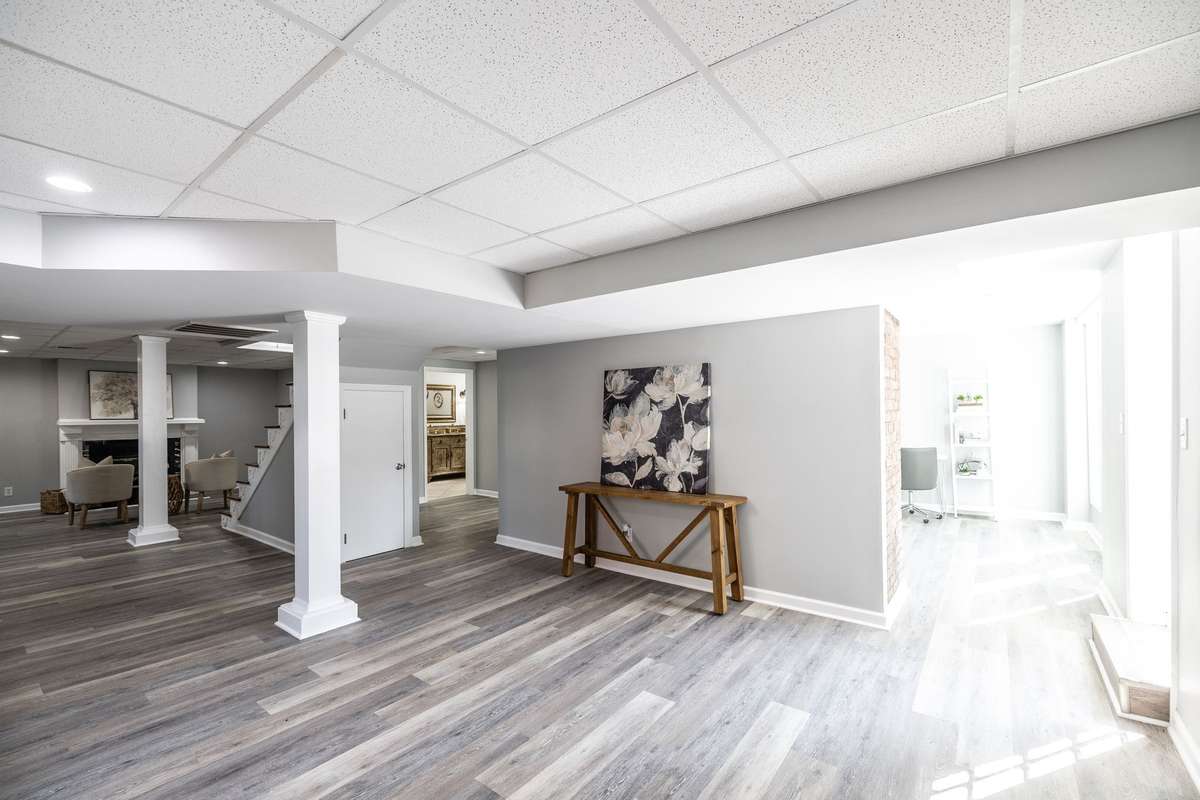 Spacious finished basement offering the perfect setting for a recreation room, complete with fresh flooring and ample natural light.
