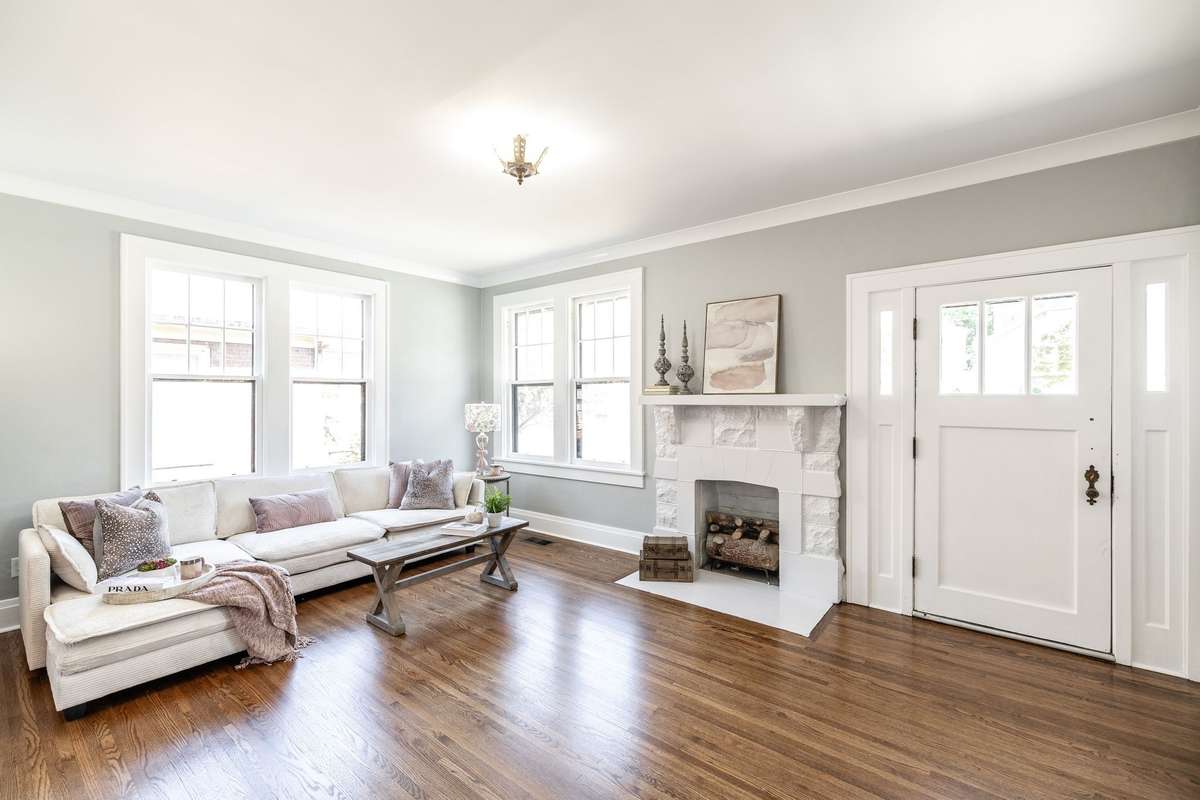 A wide view of the living area shows how the hardwood floors flow seamlessly, enhancing the home’s classic feel.