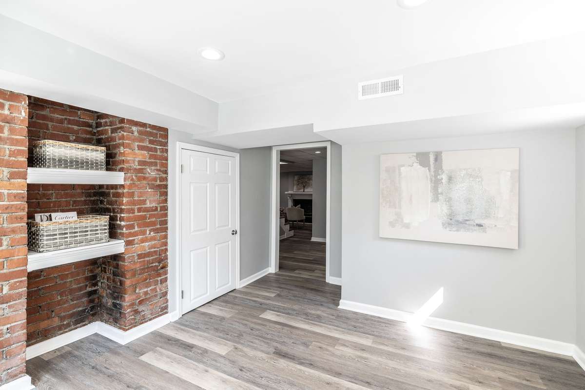 Natural light highlights the beauty of the exposed brick, giving this basement a warm and welcoming feel perfect for a variety of uses.