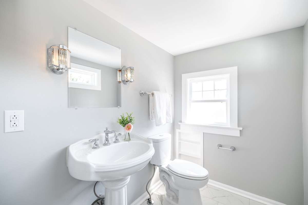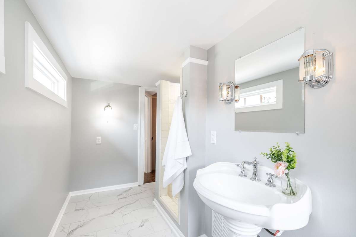 Bright and fresh main level bathroom featuring a classic pedestal sink and updated fixtures.