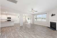 everyday living and entertaining. Cozy corner fireplace highlights the family room.